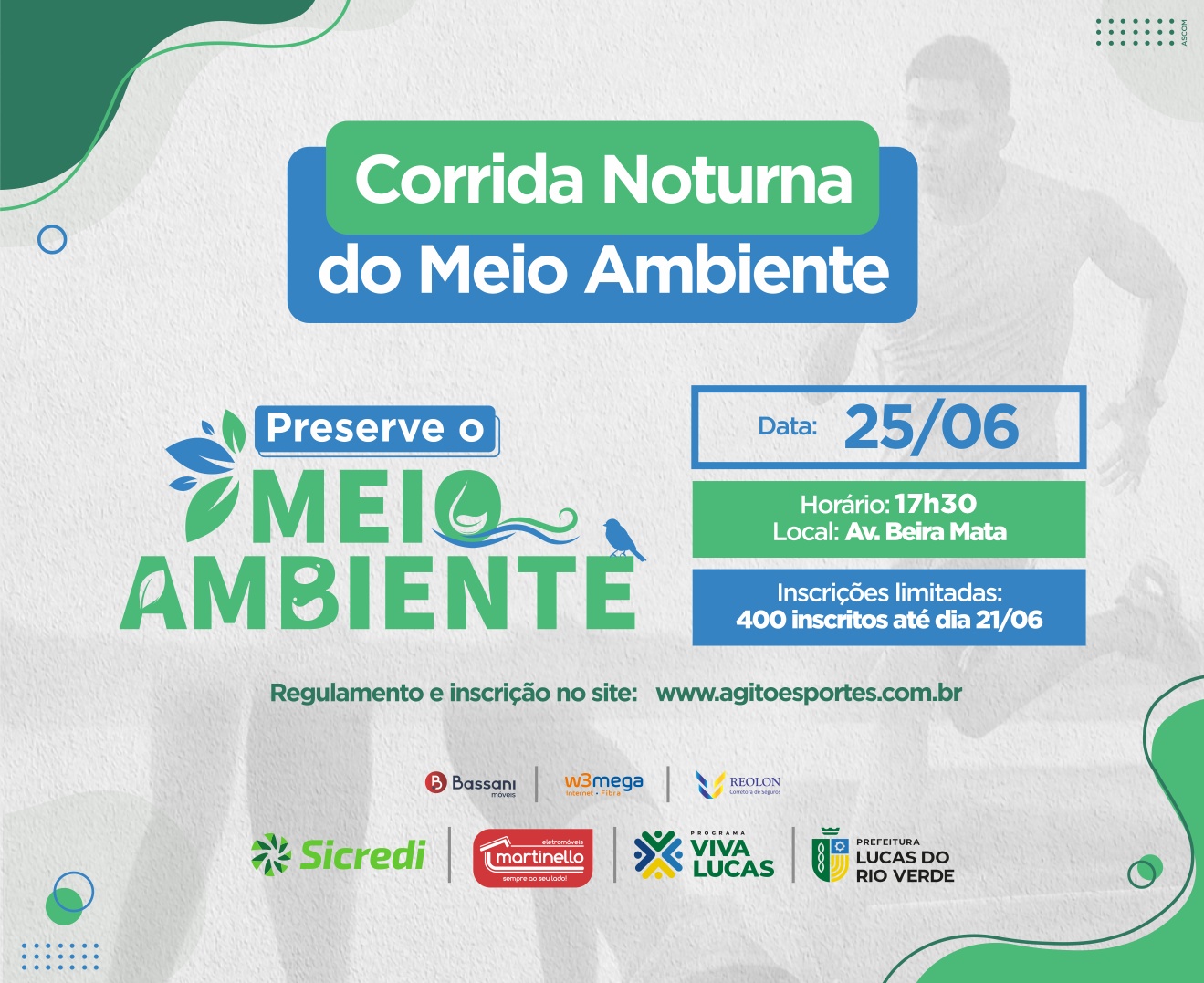 Para se inscrever, o atleta deve acessar o site: agitoesportes.com.br/eventos/corrida-noturna-do-meio-ambiente.