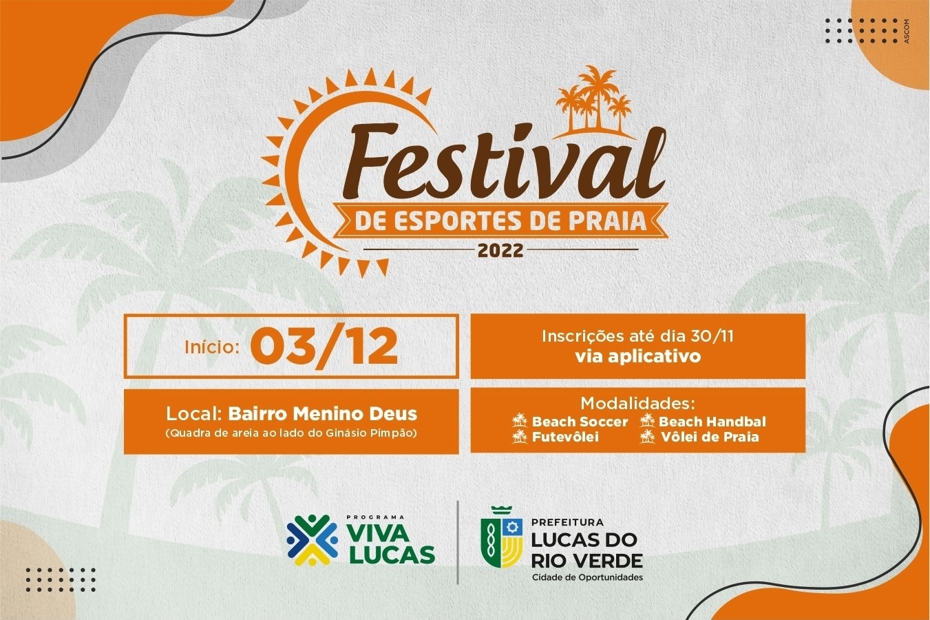 A Prefeitura de Lucas do Rio Verde lançou, nesta terça-feira (22), as inscrições para o Festival Municipal de Esportes de Praia. O evento será realizado nos dias 03 e 04 de dezembro, pela Secretaria de Esporte e Lazer e o Programa Viva Lucas.