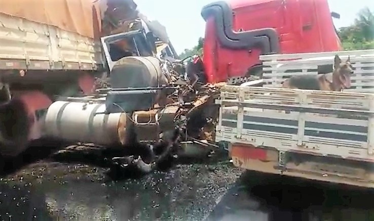 A colisão teria sido frontal e a carreta vermelha acabou atingindo a F-1000. A pancada foi tão forte que a cabine da Scania se desprendeu do eixo.