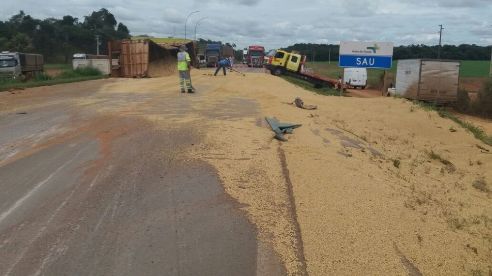 A pista ficou interditada em ambos os sentidos, até que funcionários da Roda do Oeste tirassem parte do soja do asfalto.