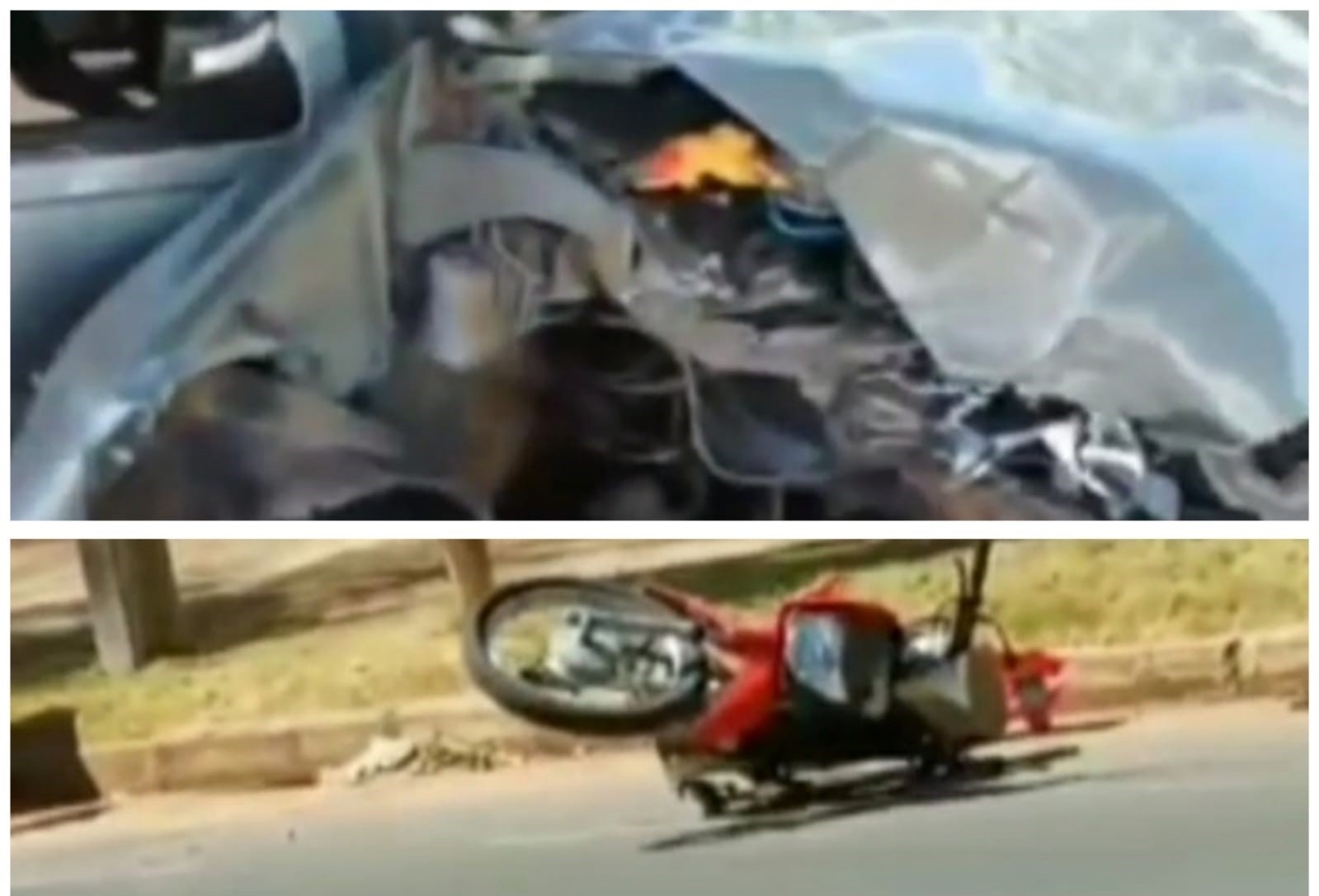 Com o impacto da batida, uma das rodas do carro foi arrancada. Os veículos ficaram completamente destruídos, sendo que o automóvel teve perda total.