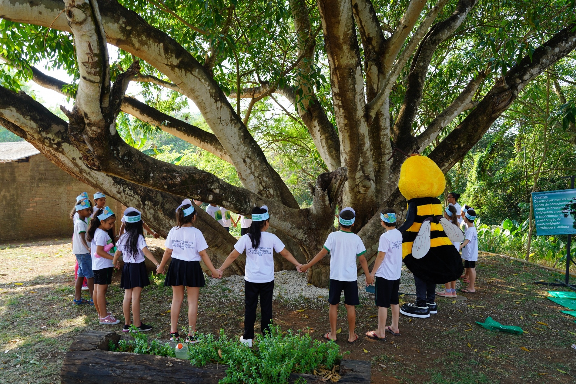 Cerca de 30 alunos se uniram, formaram uma grande roda em volta da árvore e, com um abraço, simbolizaram uma importantíssima atitude, a gratidão.