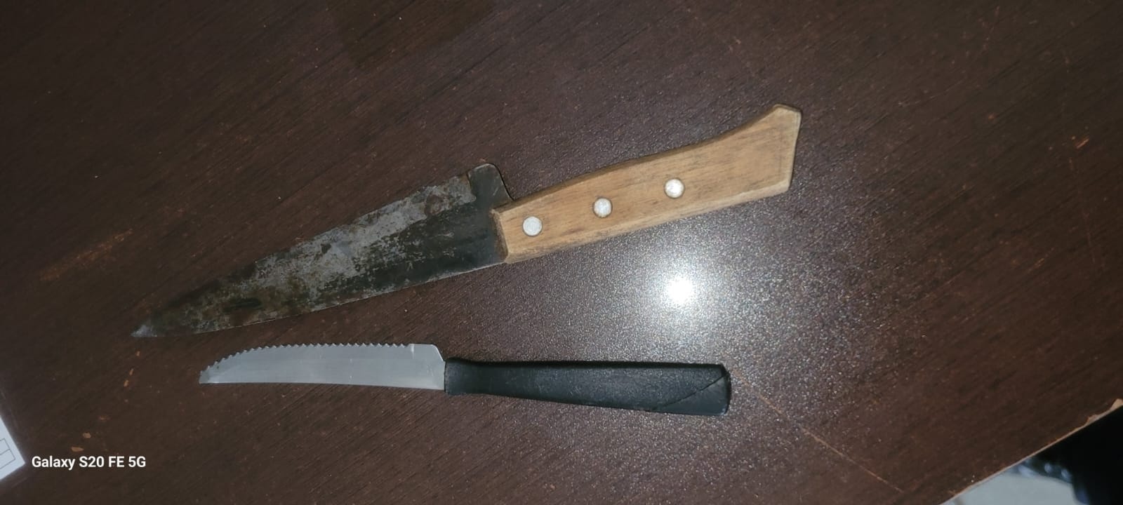 Diante da complexidade do caso, duas guarnições foram ao local, onde a denuncia foi confirmada. O acusado estaria bebendo na conveniência do estabelecimento, quando foi feita uma busca pessoal. As duas facas estavam em seu poder, e o suspeito recebeu voz de prisão.