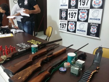 Foram apreendidas, uma espingarda calibre 28, duas espingardas calibre 22, uma calibre 36 e um revólver calibre 38, além de 51 munições de calibre 36, 15 munições de calibre 28, 249 munições de calibre 22, 04 de 32, 17 munições deflagradas de calibre 38 e sete intactas. Todo o material foi encaminhado para a Delegacia de Polícia.