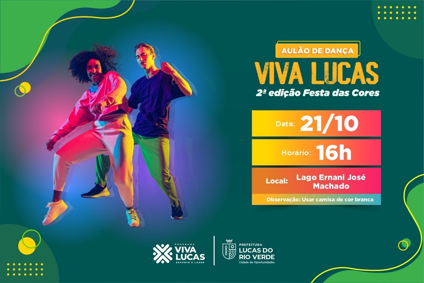 Neste sábado (21), às 16h, a Prefeitura de Lucas do Rio Verde, por meio da Secretaria de Esporte e Lazer promove mais um aulão de dança do Programa Viva Lucas. Desta vez, o cenário para a atividade física e de lazer será o Lago Ernani José Machado.