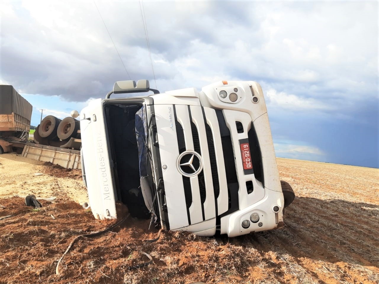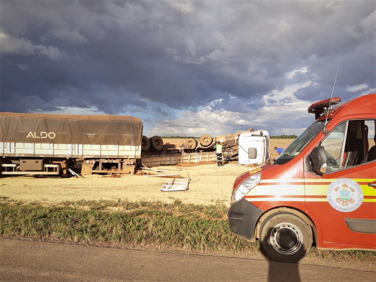 Bombeiros atendem motorista de caminhão que tombou na MT-449