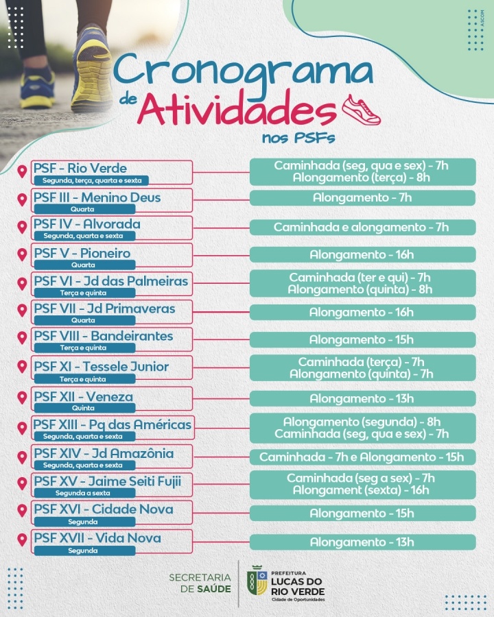 Pensando nisso, as equipes das unidades de saúde de Lucas do Rio Verde desenvolvem atividades físicas para os pacientes, juntamente com os profissionais de fisioterapia e educadores físicos, e com a parceria do Programa Viva Lucas, da Secretaria de Esporte e Lazer. Entre as atividades estão caminhadas e alongamentos.