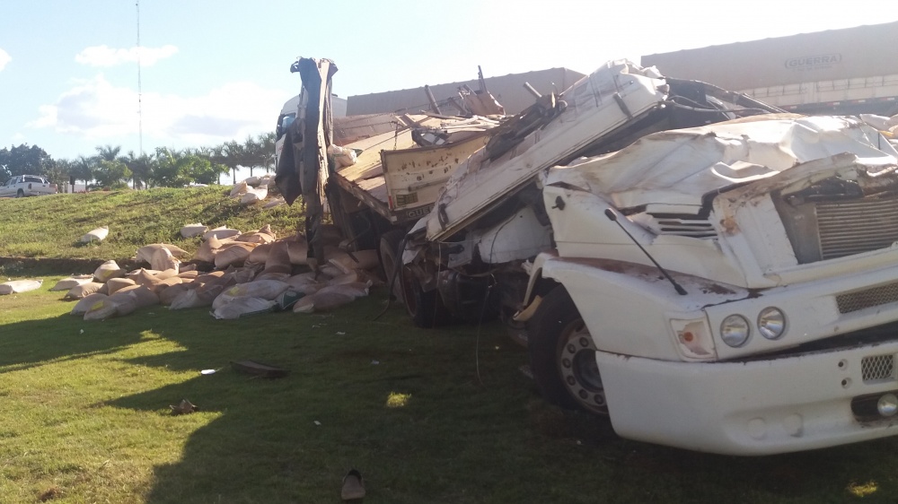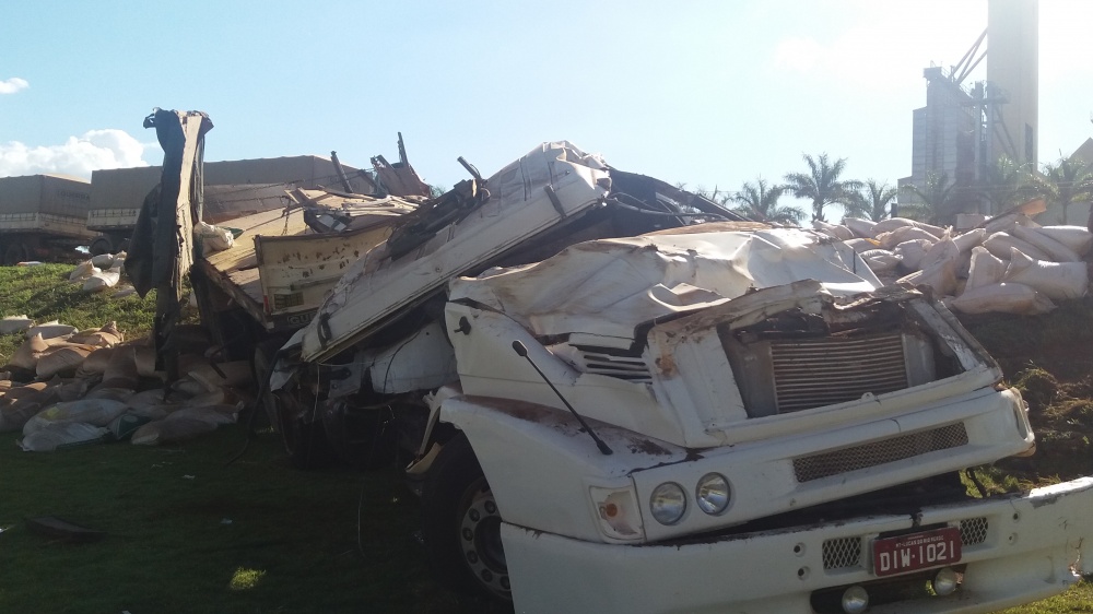 Um caminhão LS 1935, Mercedes, ficou completamente destruído agora por volta das 14h30 desta segunda-feira, em um acidente registrado no perímetro urbano de Lucas do Rio Verde. O motorista do caminhão, que estava carregado com sacas de milho, não se machucou.