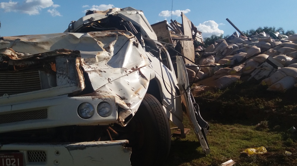 Caminhão fica destruído em tombamento no perímetro urbano de Lucas