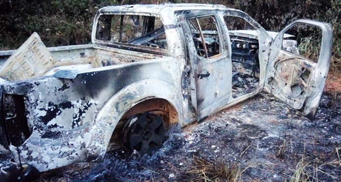 Caminhonete é encontrada destruída pelo fogo em fazenda no Campinho Verde