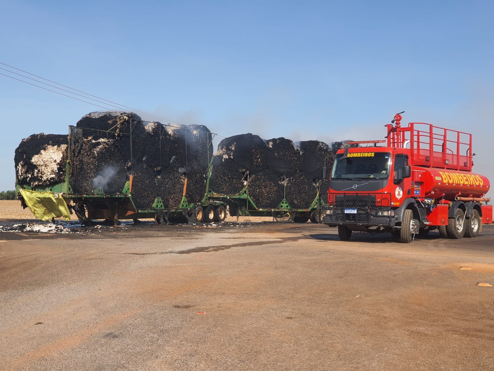 Na tarde desta quinta-feira (28), por volta das 13h20, uma guarnição do Corpo de Bombeiros Militar de Lucas do Rio Verde, foi acionada via 193 para atender uma ocorrência de incêndio em carreta carregada com algodão, na MT-485 (distante cerca de 18km de Lucas).