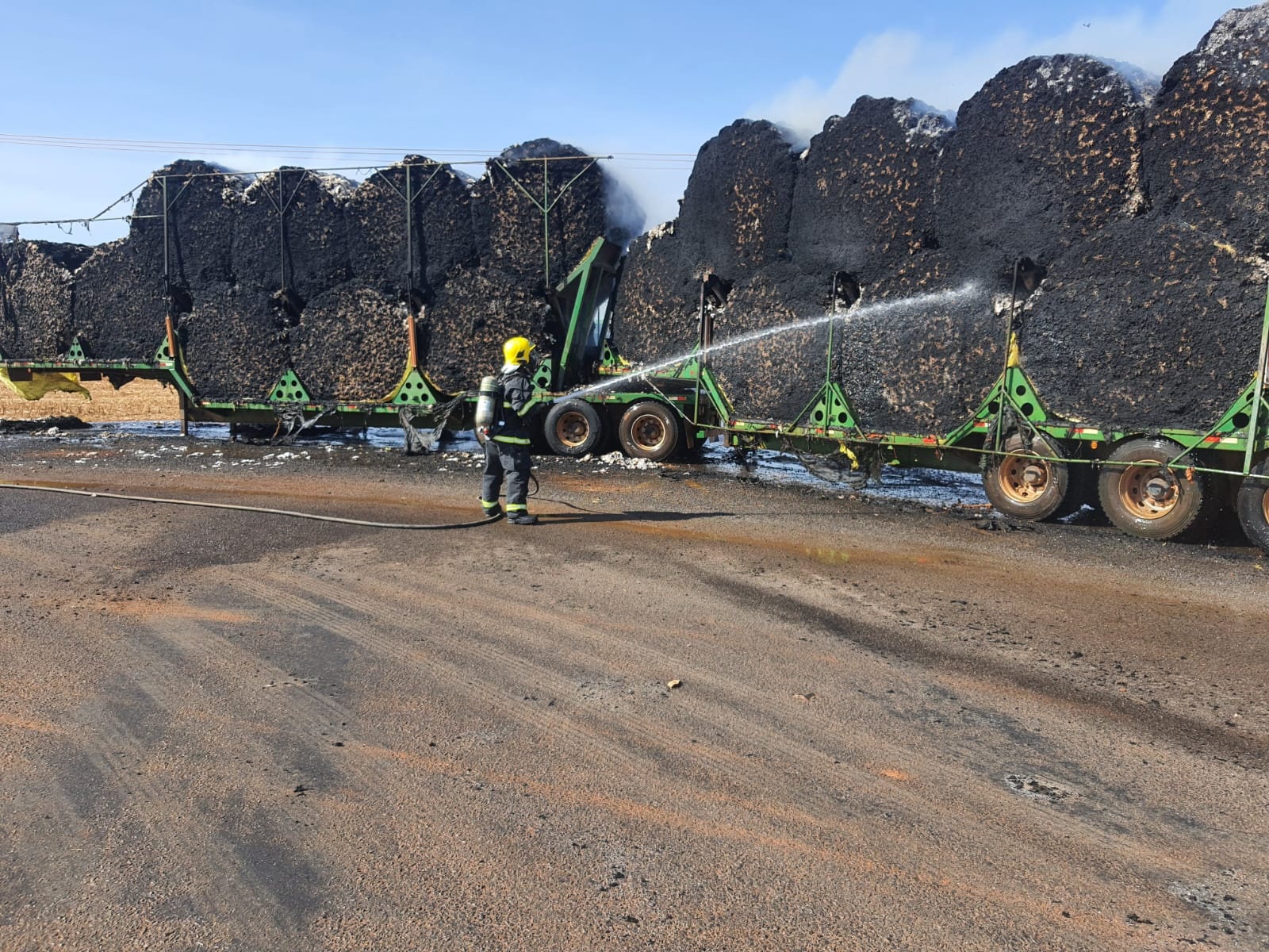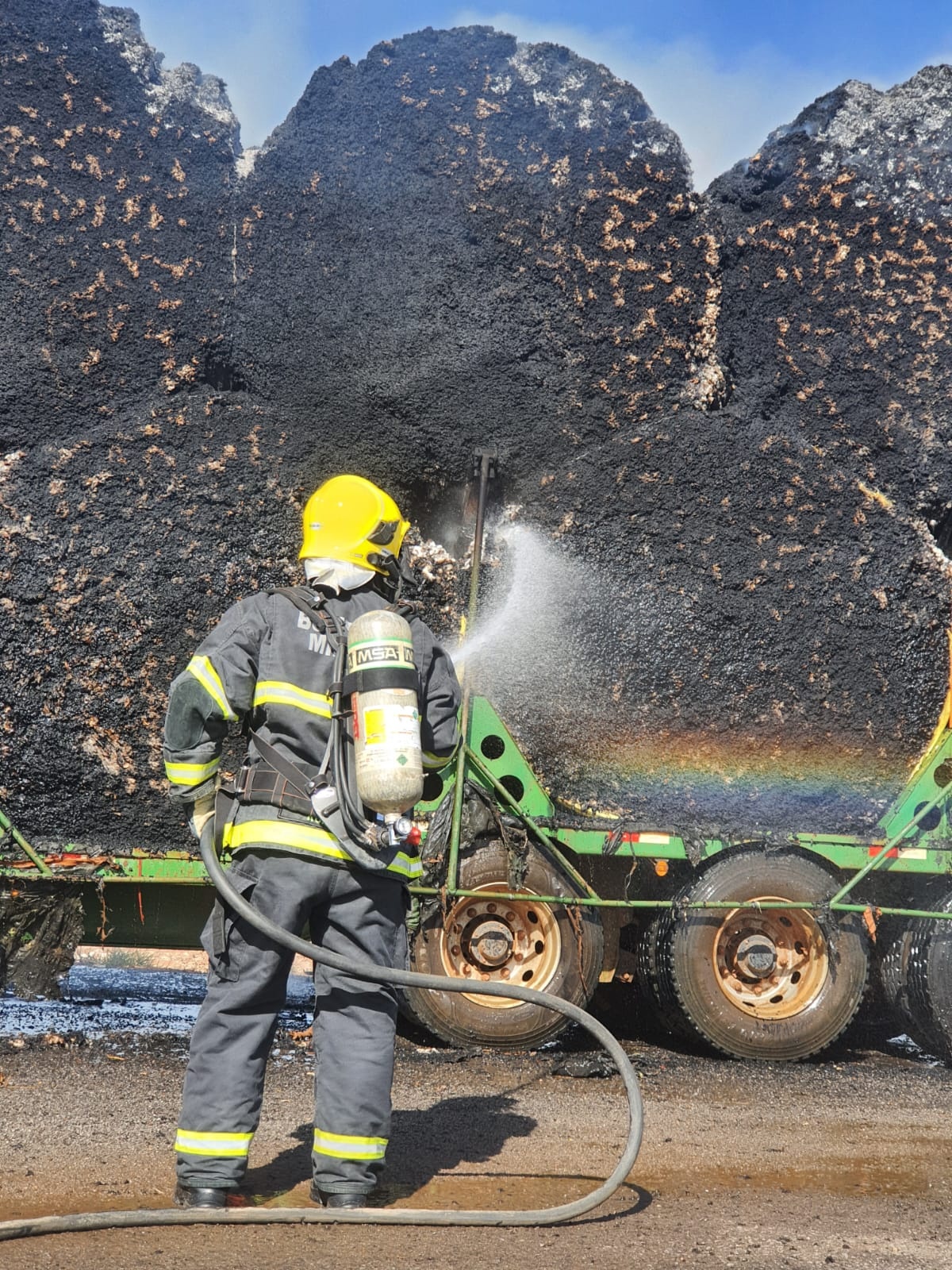 Por se tratar de uma carga de um material inflamável, os militares solicitaram apoio de uma pá carregadeira para que conseguissem espalhar o material combustível, atacando de forma direta o foco do incêndio.