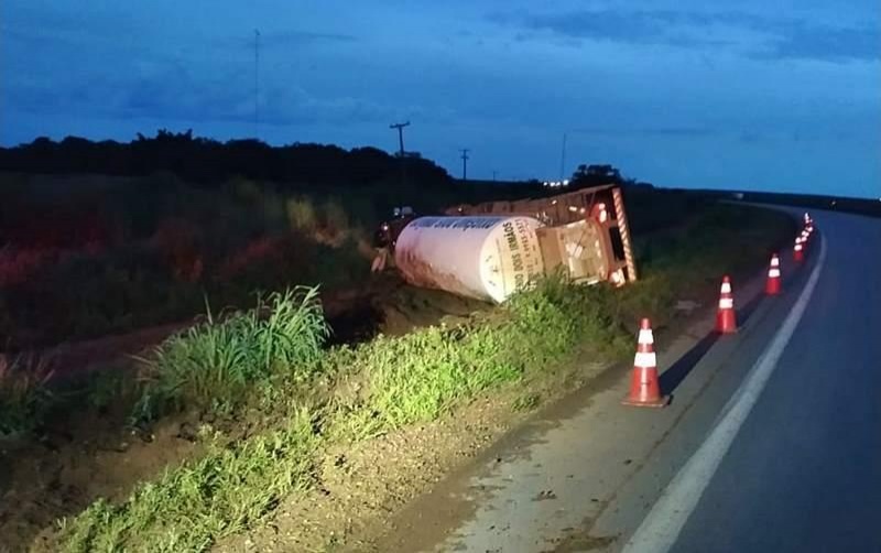 Carreta com oxigênio líquido tombou na BR-163 em Lucas do Rio Verde