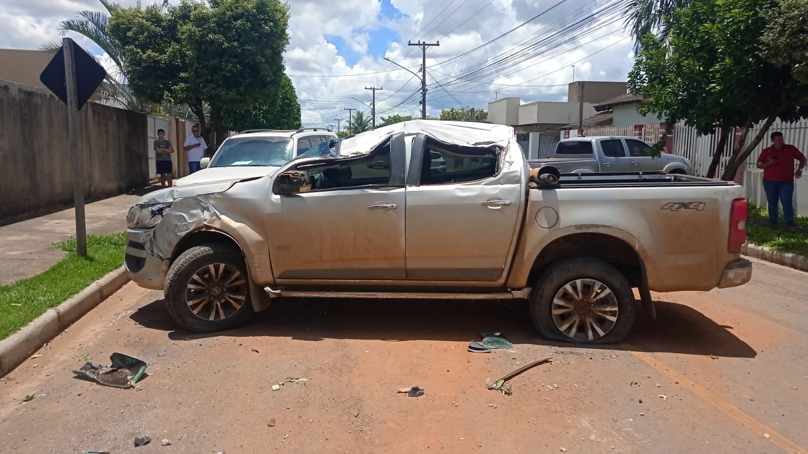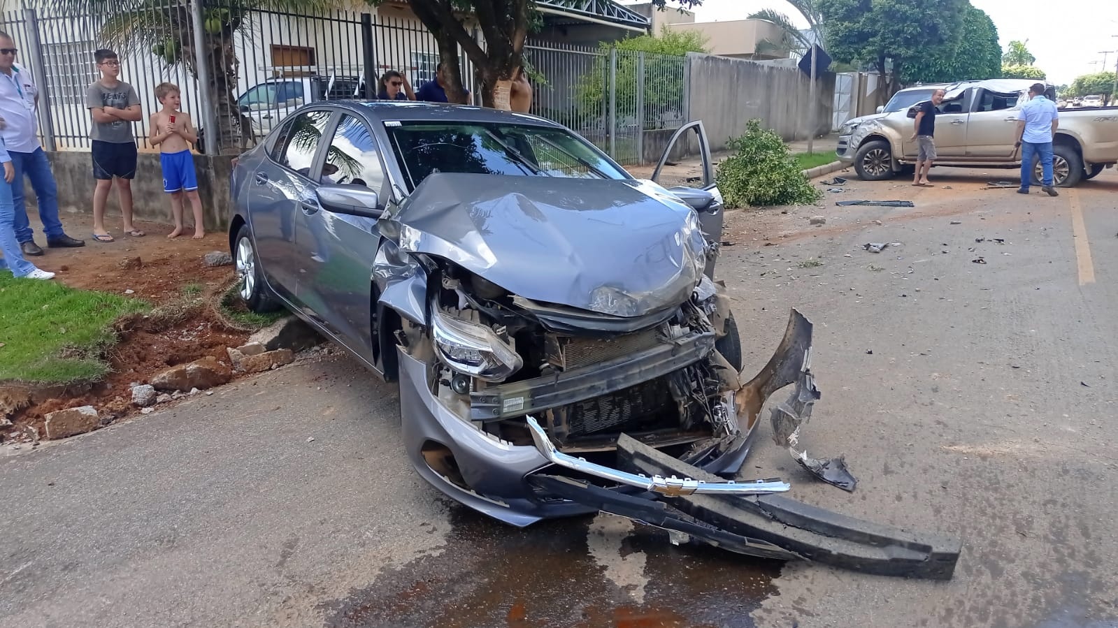 Com o impacto, o veículo utilitário ficou atravessado na via pública, chamando a atenção de populares. Os danos na parte superior foram provocados porque a caminhonete foi lançada em direção à uma árvore. Por este motivo o veículo não tombou ou capotou.
