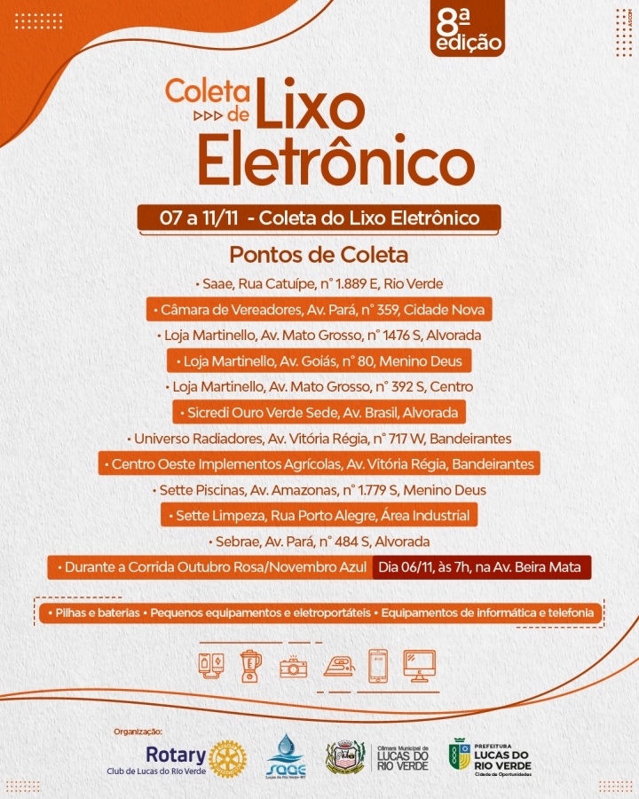 Em sua 8ª edição, a de coleta de lixo eletrônico será realizada de 07 a 11 de novembro em Lucas do Rio Verde. Além de contribuir com o meio ambiente, a venda de todo o material será revertida para o Hospital de Câncer de Mato Grosso. Os pontos de recebimento serão em lojas parceiras em diversos locais da cidade.