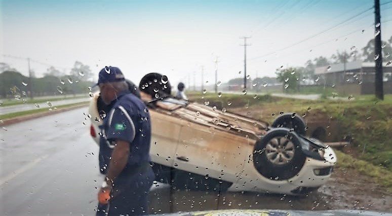 Com pista molhada e mancha de óleo, carro capota na Rodovia MT-449