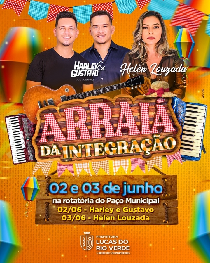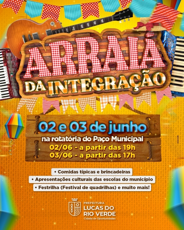 A Prefeitura de Lucas do Rio Verde, por meio das secretarias de Educação e de Cultura e Turismo, convida a população para prestigiar mais uma edição do Arraiá da Integração. A festa junina é aberta ao público e acontece nesta sexta-feira e sábado (02 e 03), na rotatória do Paço Municipal.