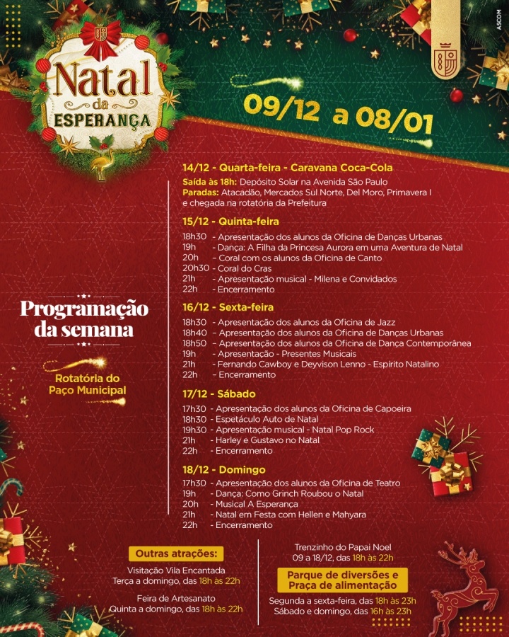 Já a visitação na Vila Encantada, com a Casa do Papai Noel e outras atrações, será de terça a domingo, das 18h às 22h. O Trenzinho ficará na cidade até este domingo, dia 18 de dezembro, e as apresentações culturais acontecem no palco do Natal da Esperança de quinta a domingo, a partir das 18h.