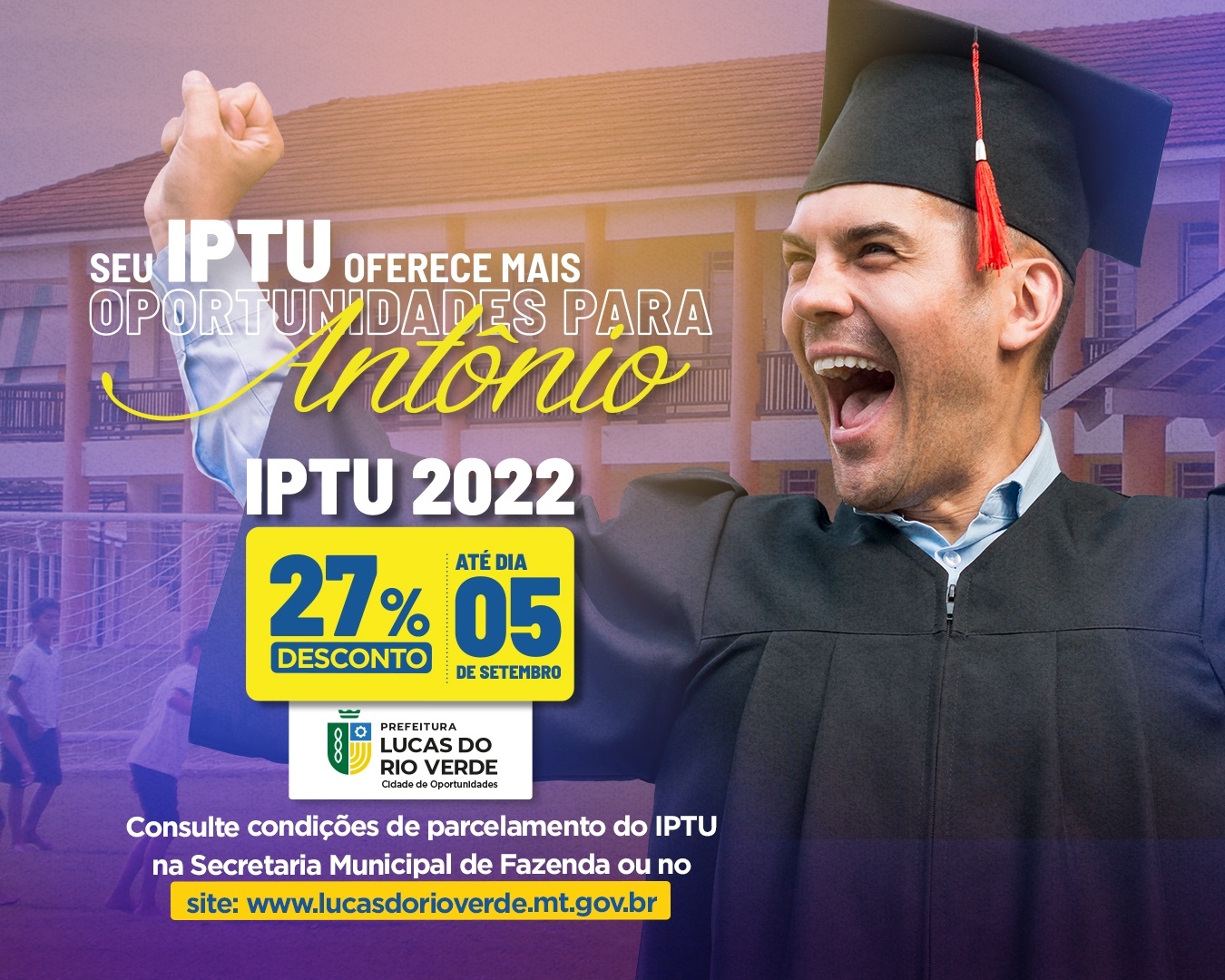 A Prefeitura de Lucas do Rio Verde, por meio da Secretaria de Fazenda, informa que os contribuintes que desejam realizar o pagamento do Imposto Predial Territorial Urbano –IPTU 2022 com 27% de desconto, em cota única, têm até o dia 05 de setembro para fazer a quitação do débito. O Município também disponibiliza a opção de pagamento parcelado.