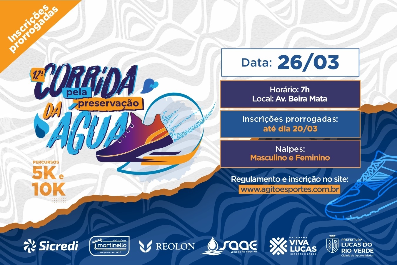 As inscrições da Corrida pela Preservação da Água, foram prorrogadas até o dia 20 de março. A ação será realizada no dia 26 de março, com largada às 7h, na avenida Beira Mata.