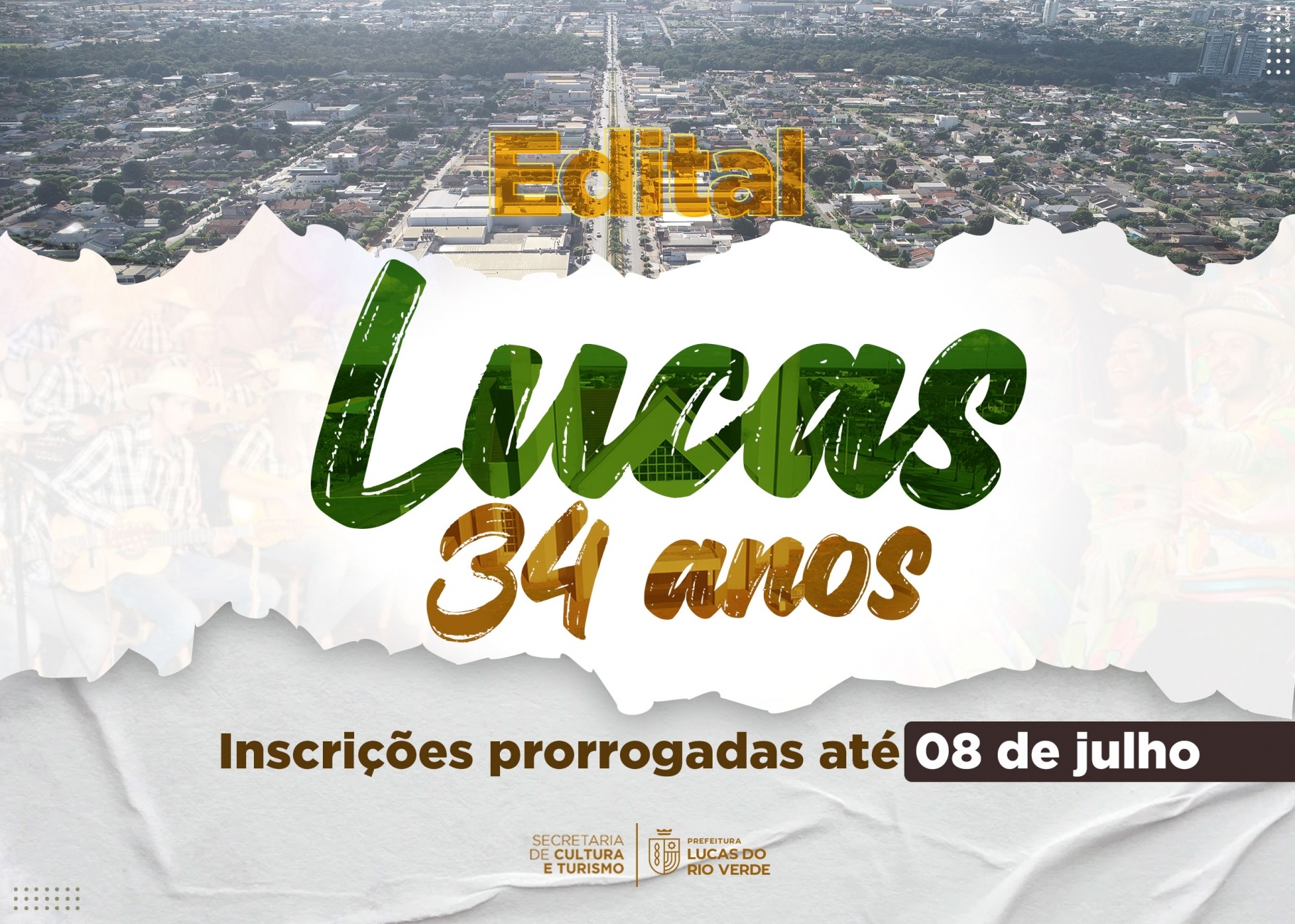 A Secretaria de Cultura e Turismo de Lucas do Rio Verde informa que as inscrições do edital “Lucas 34 anos” foram prorrogadas. Agora, os produtores culturais têm até o dia 08 de julho para enviar as propostas.