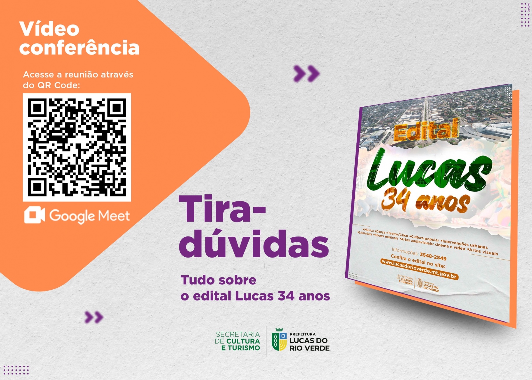 A Secretaria de Cultura e Turismo de Lucas do Rio Verde convida os produtores culturais do município para participarem do 1º Plantão Tira-dúvidas sobre o edital “Lucas 34 anos”.