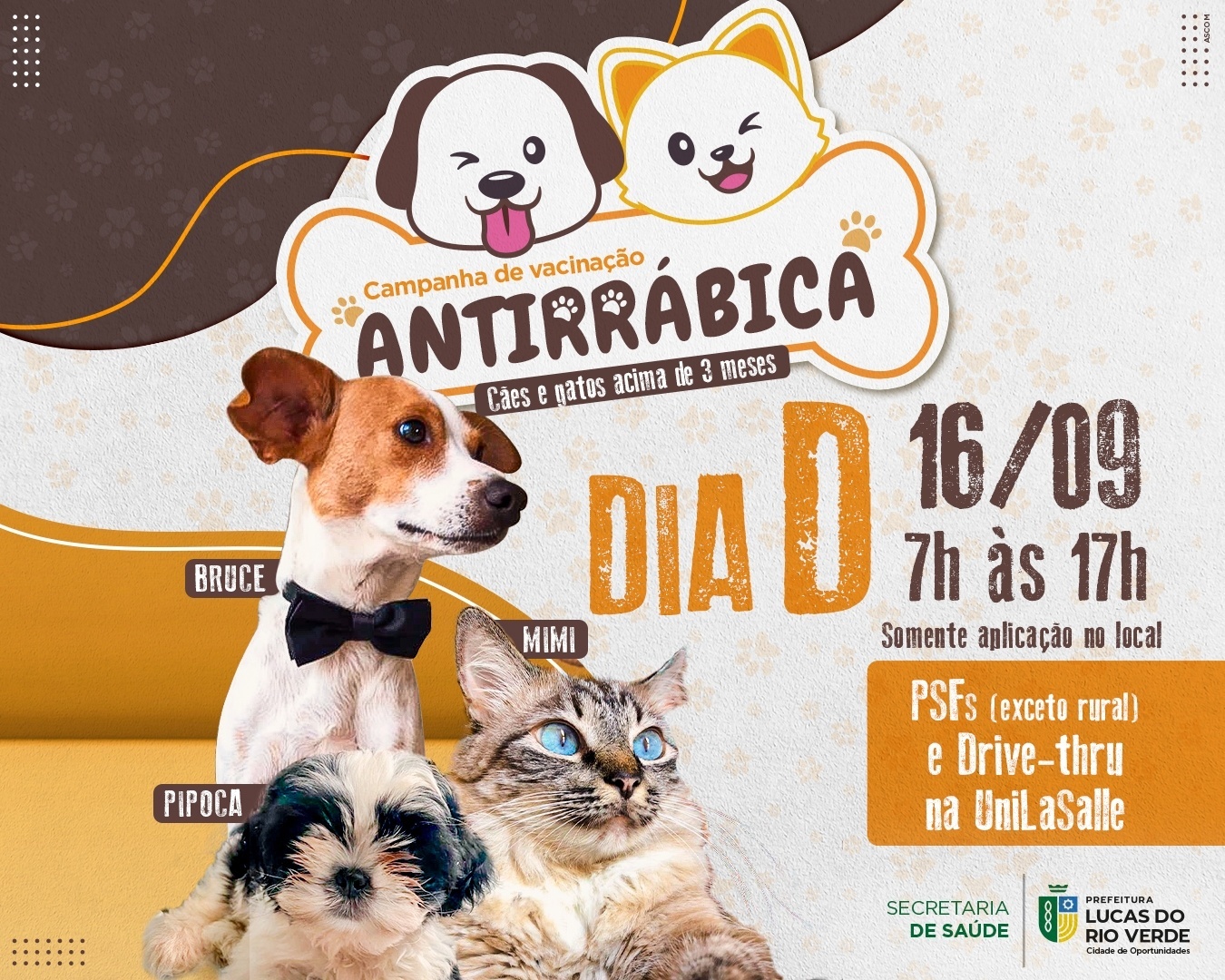 Para colocar a vacinação dos pets em dia, a Prefeitura de Lucas do Rio Verde, por meio da Secretaria de Saúde, convoca a população para levar cães e gatos no dia D da campanha.