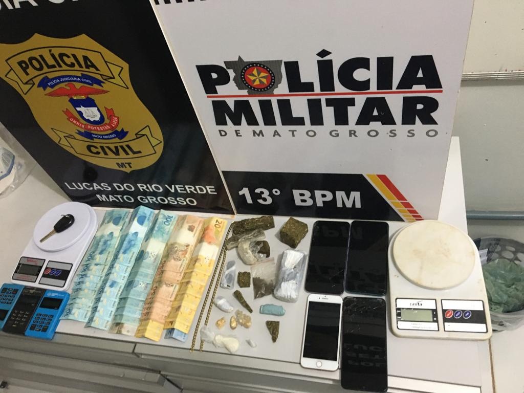 Quatro tipos de entorpecentes - maconha, haxixe, pasta base de cocaína e cocaína, além de apetrechos usados para embalar drogas foram apreendidos na residência alvo das buscas no Parque das Américas. A ação foi coordenada pela Delegacia de Lucas do Rio Verde e contou com apoio da Polícia Militar. Mais de R$ 4 mil em dinheiro foram apreendidos com o principal suspeito.