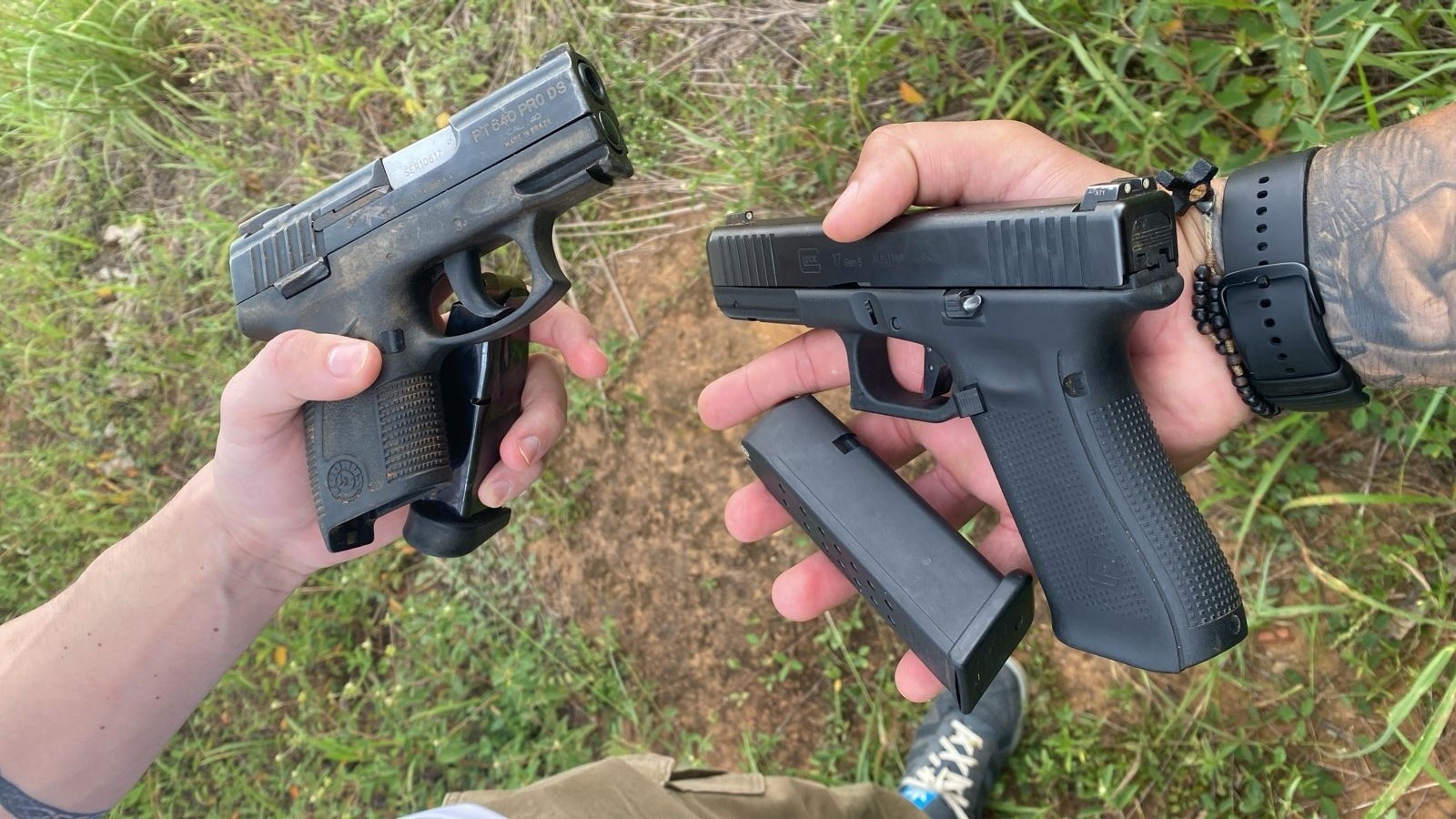 Ao chegar no local, os suspeitos passaram a empreender fuga pulando os muros e evadindo para uma região próxima de mata. Após acompanhamento, os militares fizeram a prisão de um suspeito, e, minutos depois foi possível visualizar um segundo suspeito, que este se encontrava com uma arma de fogo em mãos, que ao ver os policiais fez menção de sacar seu armamento, sendo necessário efetuar disparos para repelir o assaltante, ainda assim se evadiu deixando cair uma mochila com duas armas dentro (uma pistola Glock e um revólver calibre 32).