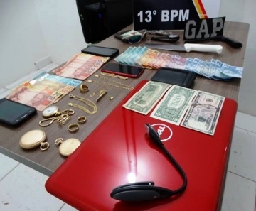 Conforme o soldado Nascimento, os dois usaram um simulacro de arma de fogo e uma faca para render duas vítimas que estavam na residência. Enquanto praticavam o roubo, uma terceira pessoa chegou ao local, de motocicleta, e também foi rendida. A dupla chegou a tentar levar o veículo, mas não conseguiu ligar a motocicleta, fugindo a pé do imóvel, levando dinheiro (cerca de R$ 950), celulares, notebook e mochila com pertences pessoais da família.