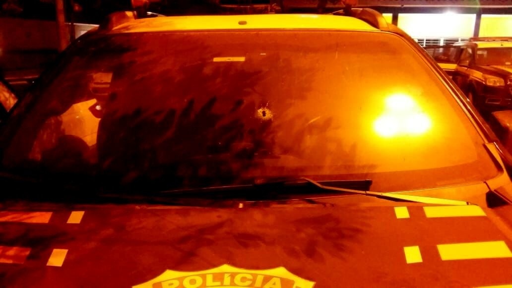 Um projétil atingiu o pára-brisas da viatura, mas nenhum policial foi ferido.