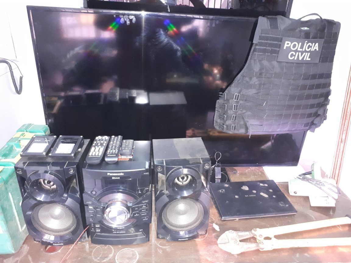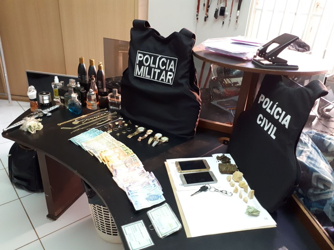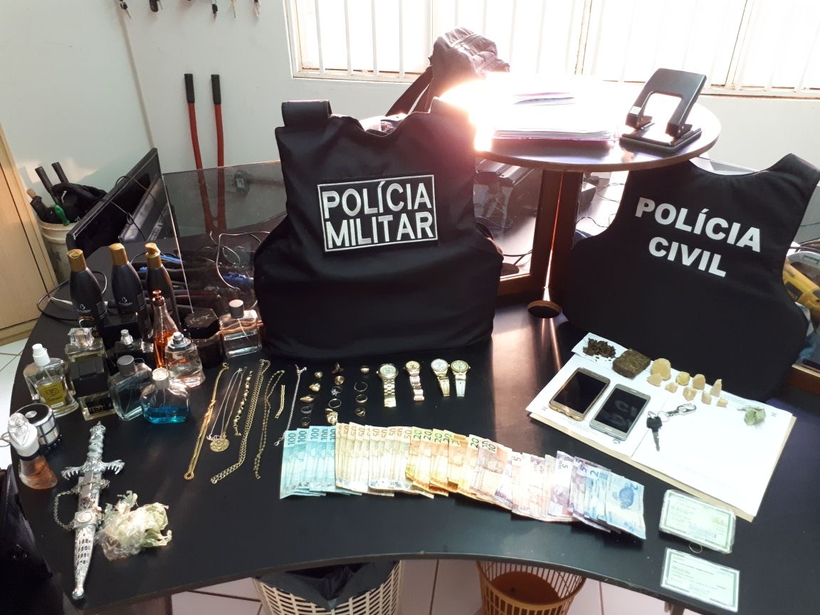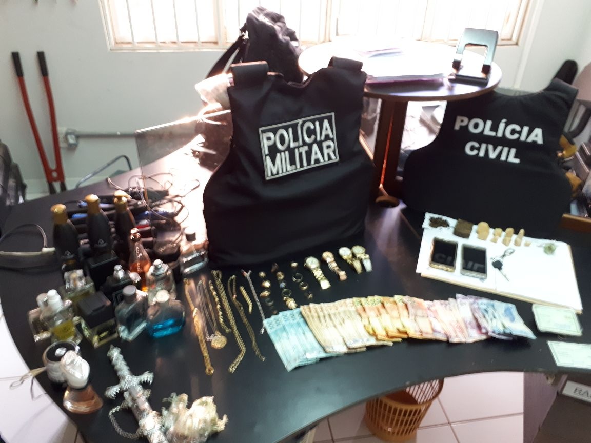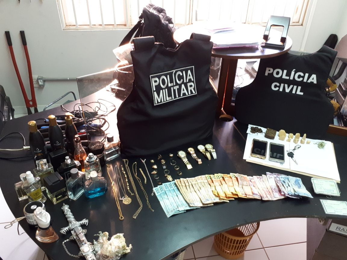 Objetos como perfumes, secadores de cabelos, pranchinhas, aparelhos de TV, semijoias, entorpecentes, aproximadamente R$ 1 mil em dinheiro e uma motocicleta foram apreendidos.