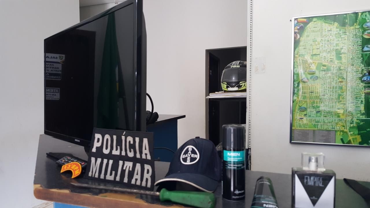 A Policia Militar realizou a detenção de um homem suspeito de ter cometido furto de um aparelho de TV Samsung de 32’’ com controle remoto. Com o suspeito, os policiais localizaram ainda espuma de barbear; loção pós-barba e perfume. A policia acredita que o homem tenha invadido alguma residência no bairro Bandeirantes, e teria utilizado uma chave de fenda para abrir alguma janela, pois o mesmo carregava consigo a ferramenta.