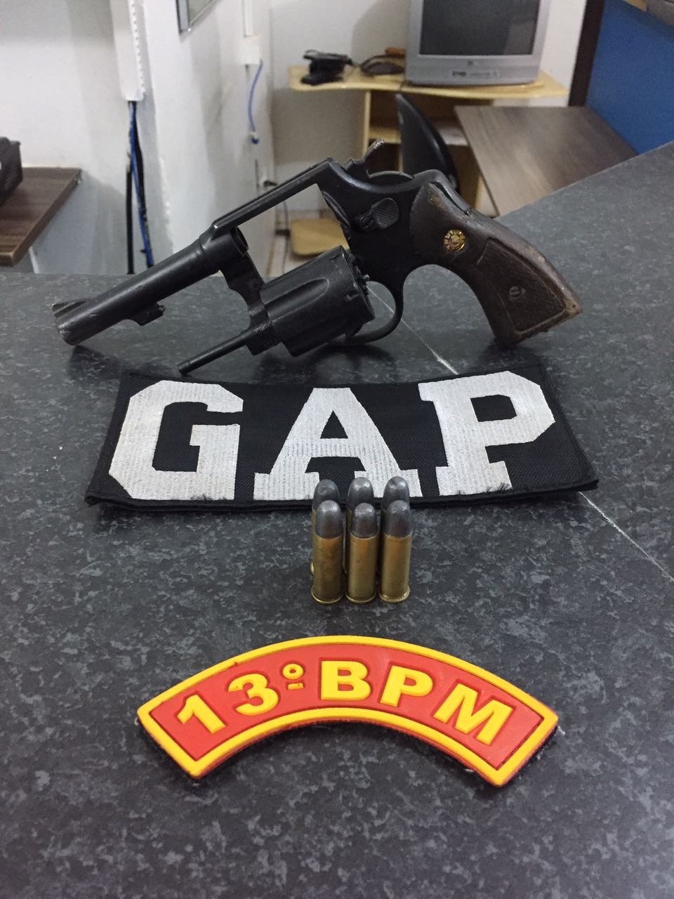 Ao avistarem a aproximação dos Militares, os suspeitos empreenderam fuga em alta velocidade pela Avenida Rio Grande do Sul. Os policiais realizaram o acompanhamento dos suspeitos, momento em que o garapa teria jogado um objeto em frente a um estabelecimento comercial. Outra viatura que dava apoio parou no local e constatou que se tratava de um revólver calibre 38 com seis munições intactas.