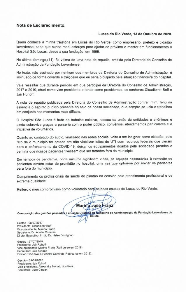 Por meio de sua assessoria, o empresário e ex-prefeito de Lucas do Rio Verde, Marino Franz, divulgou uma Nota de Esclarecimento em resposta a nota de repúdio divulgada no último domingo pela diretoria do Hospital São Lucas.