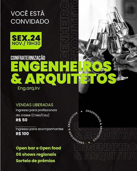 Os ingressos custam R$ 50 para engenheiros e arquitetos, R$ 100 para acompanhantes, podendo ser adquiridos pelo Instagram: @eng.arq.lrv.