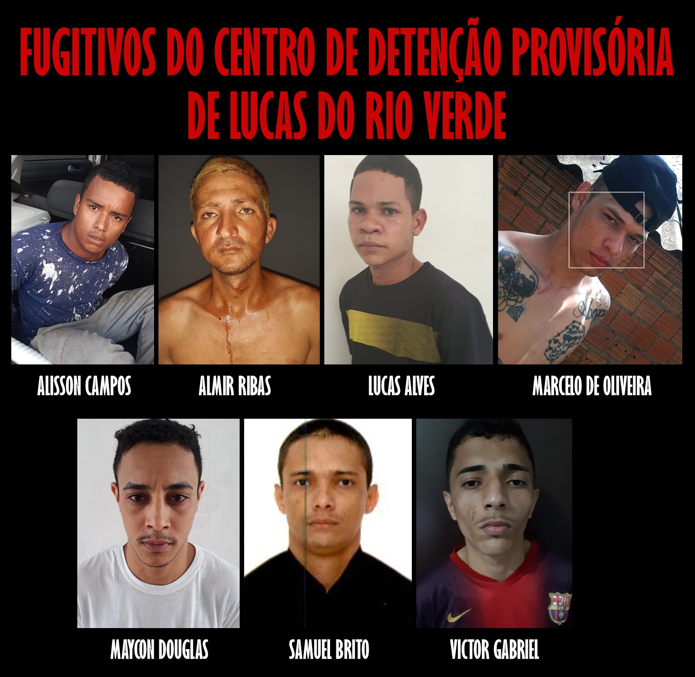 Os fugitivos são: ALISSON CAMPOS, ALMIR RIBAS, LUCAS ALVES, MARCELO DE OLIVEIRA, MAYCON DOUGLAS, SAMUEL BRITO e VICTOR GABRIEL.
