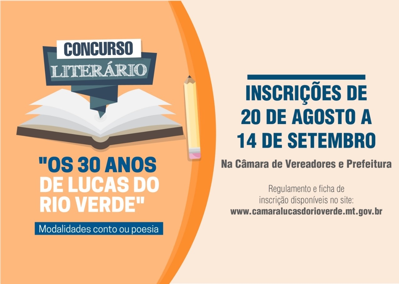 Estão abertas até o dia 14 de setembro de 2018, na Câmara de Vereadores e Prefeitura de Lucas do Rio Verde, as inscrições para o Concurso Literário, com o tema “Os 30 Anos de Lucas do Rio Verde”.
