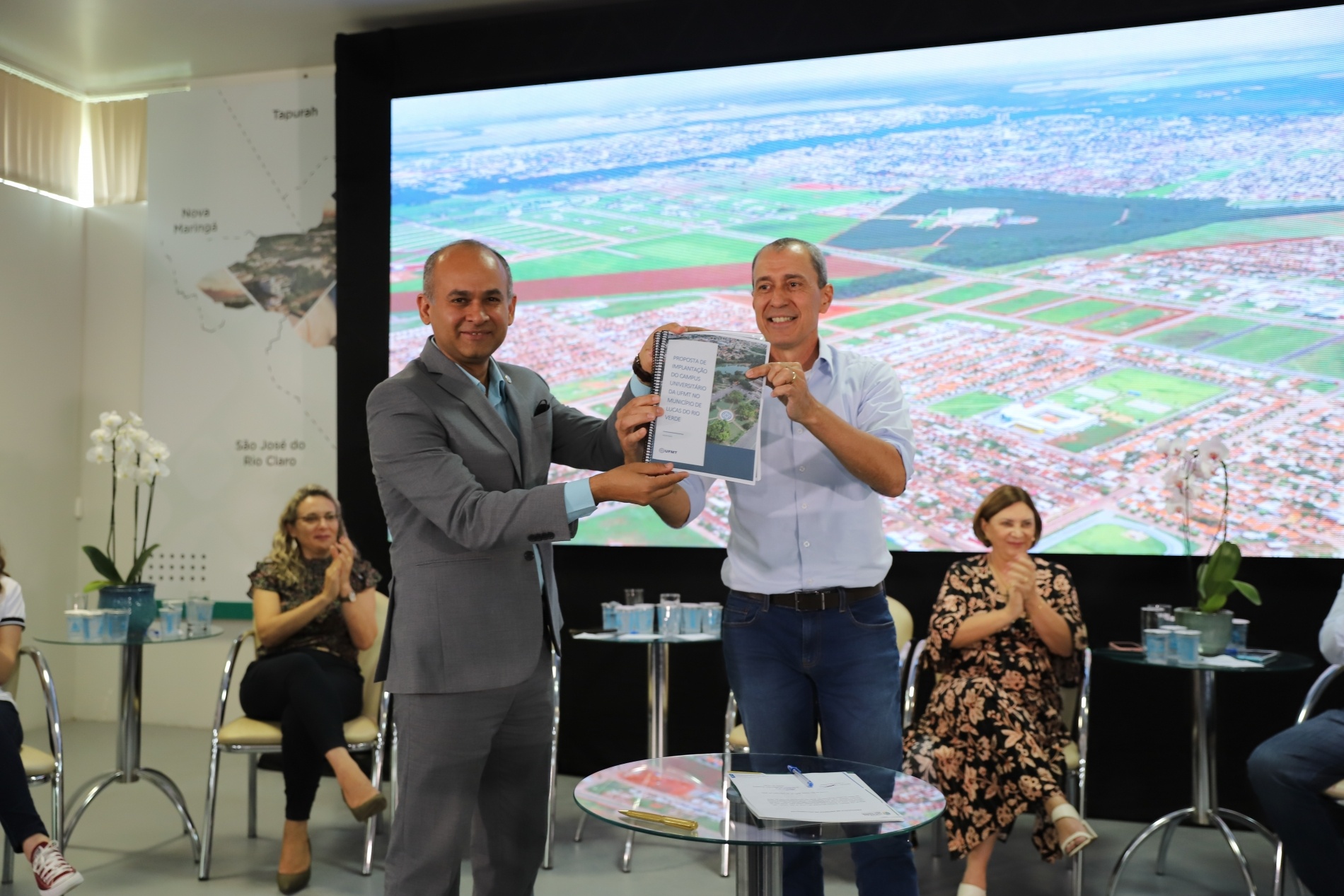 Em ato solene, realizado no Auditório dos Pioneiros, a Gestão Municipal recebeu da reitoria da Universidade Federal de Mato Grosso (UFMT) a nova proposta de criação do campus em Lucas do Rio Verde. A expectativa é que o município receba os primeiros cursos da instituição a partir de 2023, inicialmente, utilizando as salas de aula da Escola Olavo Bilac.
