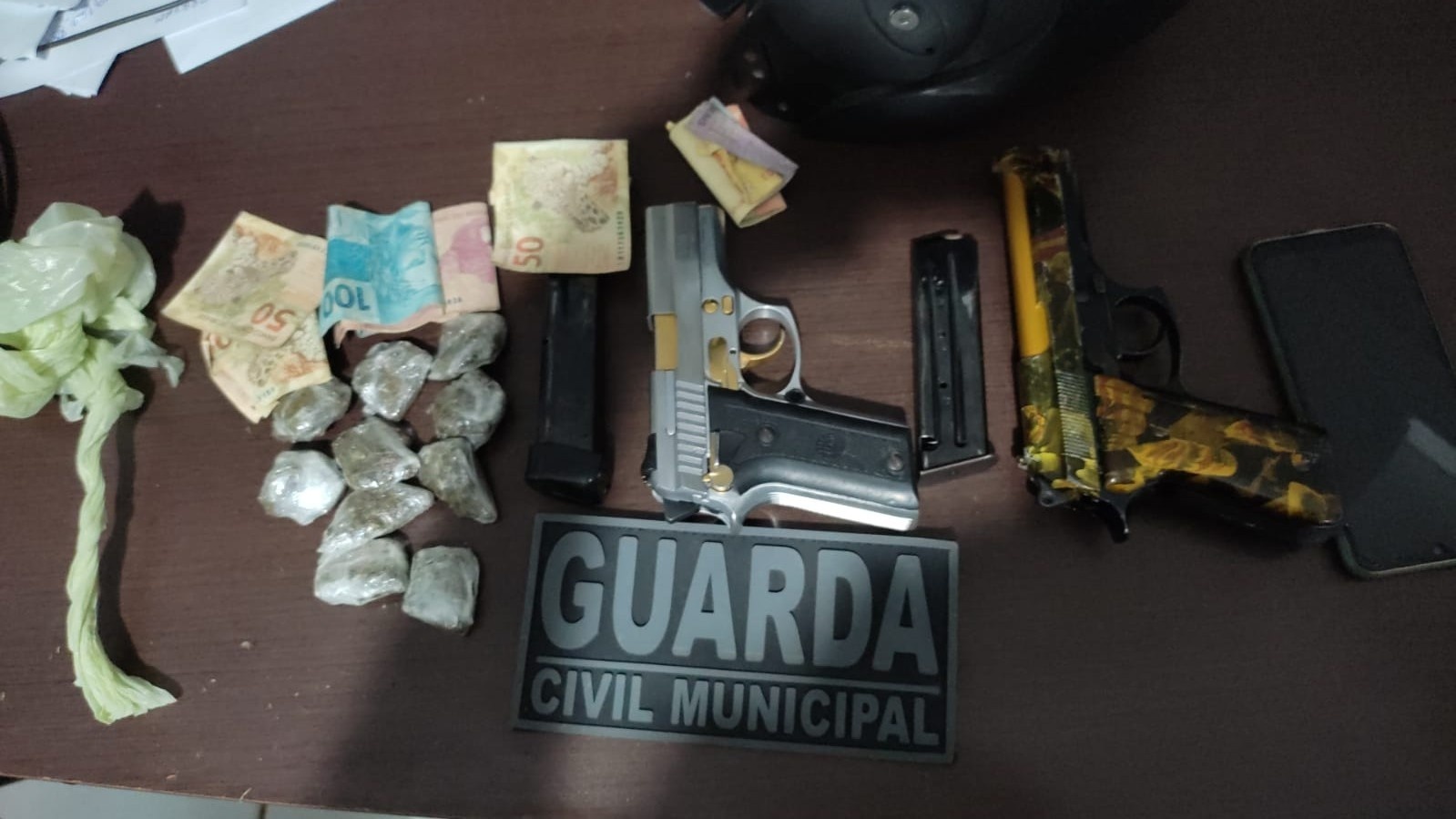 Durante a abordagem e revista pessoal, foram encontrados com os suspeitos duas armas de fogo (tipo pistola, sendo uma calibre 380 e outra 765), além de munições, porções de maconha e certa quantia em dinheiro.