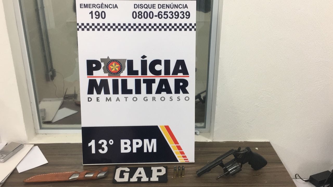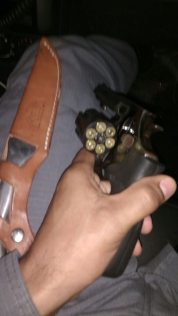 A equipe deslocou rapidamente para o local e lá chegando o homem de 43 anos tentou correr para dentro de uma residência. Mas os PMs fizeram a abordagem e na busca pessoal foi localizado em sua cintura um revólver calibre 38 com 6 munições intactas, e também uma arma branca (um faca cromada).