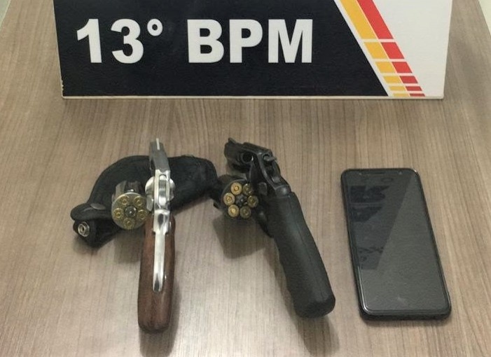 Ao efetuar revista pessoal, os policiais localizaram na cintura de um dos suspeitos, um revólver Rossi, preto, calibre 38, com seis munições intactas. Com outro suspeito foi localizado um revólver Taurus, de cor prata. Eles confirmaram que não tinham permissão para portar as armas e foram detidos e encaminhados para a delegacia.