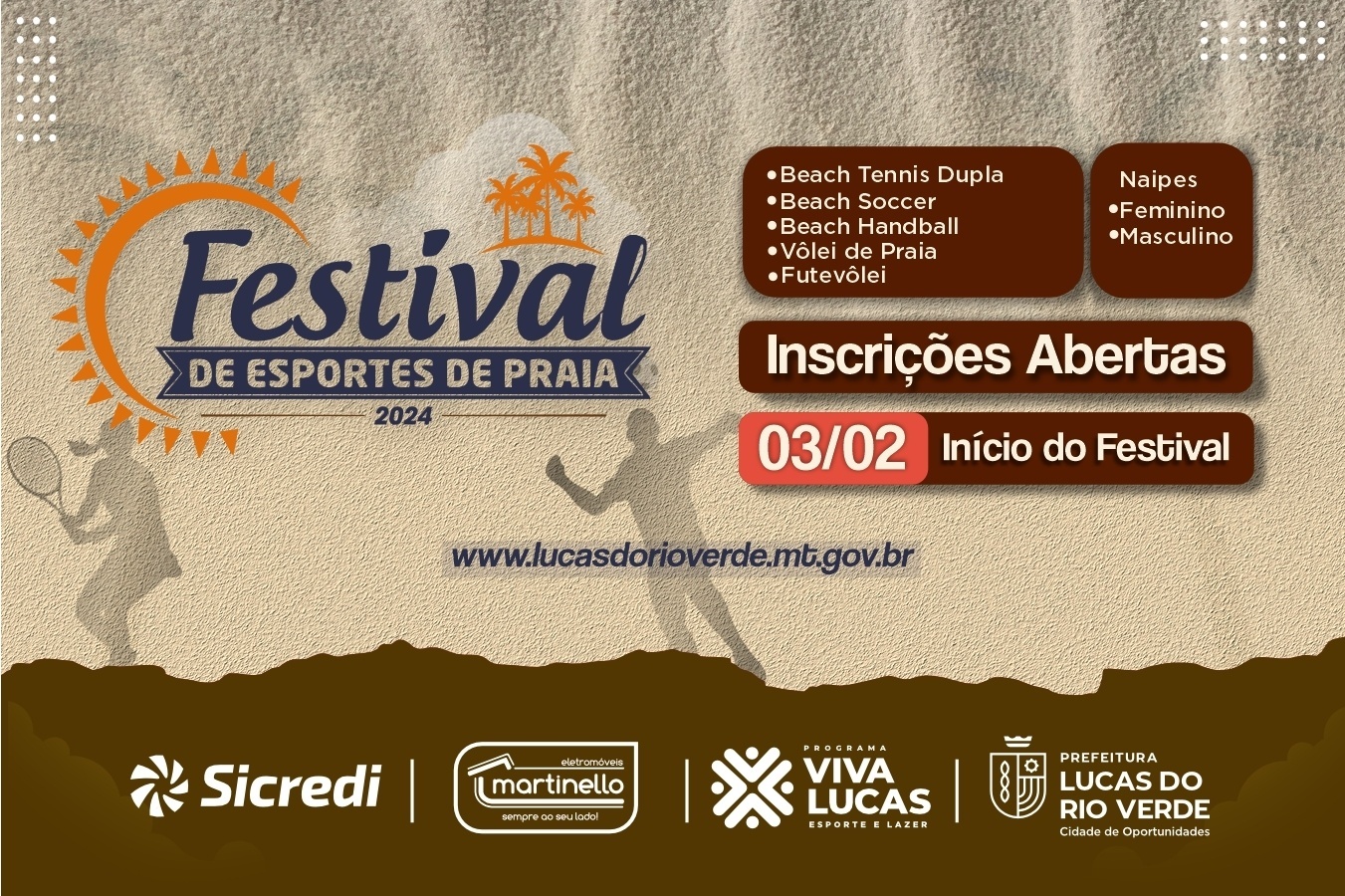 Retomando a agenda de eventos esportivos em 2024, a Prefeitura de Lucas do Rio Verde, por meio da Secretaria de Esporte e Lazer, promove entre 03 e 10 de fevereiro, o Festival de Esportes de Praia. As inscrições estão abertas e vão até o dia 31 de janeiro.