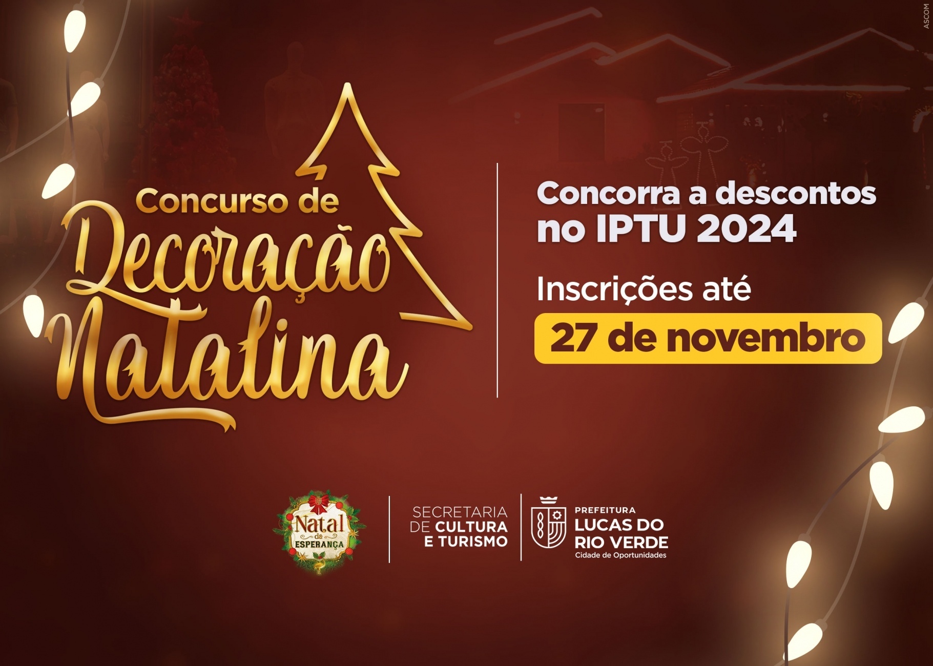 A Secretaria de Cultura e Turismo de Lucas do Rio Verde informa que as inscrições para o Concurso de Decoração Natalina terminam na próxima segunda-feira, 27 de novembro.
