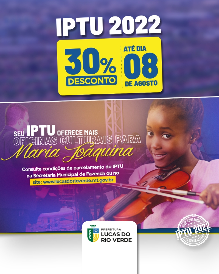 Os contribuintes que desejam realizar o pagamento do Imposto Predial Territorial Urbano –IPTU 2022 com 30% de desconto, em cota única, têm até o dia 08 de agosto para fazer a quitação do débito com a Prefeitura de Lucas do Rio Verde. O Município também disponibiliza a opção de pagamento parcelado.
