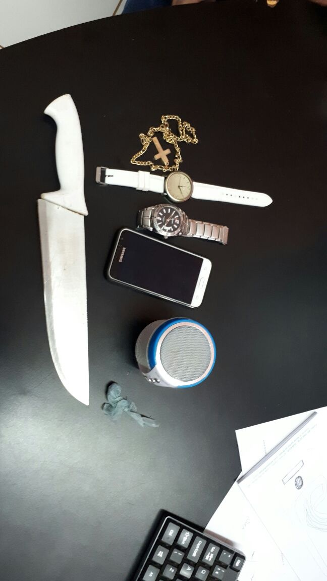 Na casa do segundo detido, os policiais localizaram 6 gramas de maconha, uma faca grande, dois relógios, uma corrente dourada e um aparelho celular Samsung.