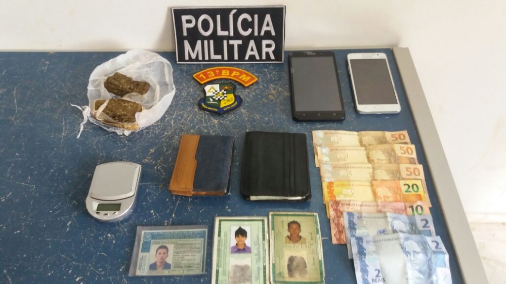 Policiais Militares realizaram a detenção de dois jovens, ambos maiores, suspeitos de tráfico de drogas. De acordo com o Tenente PM Barbosa, do 13º Batalhão de Policia Militar, os suspeitos estavam em uma motoneta Honda Biz, preta, circulando pela rua Catuipe, nas proximidades do campo de futebol do bairro Rio Verde.