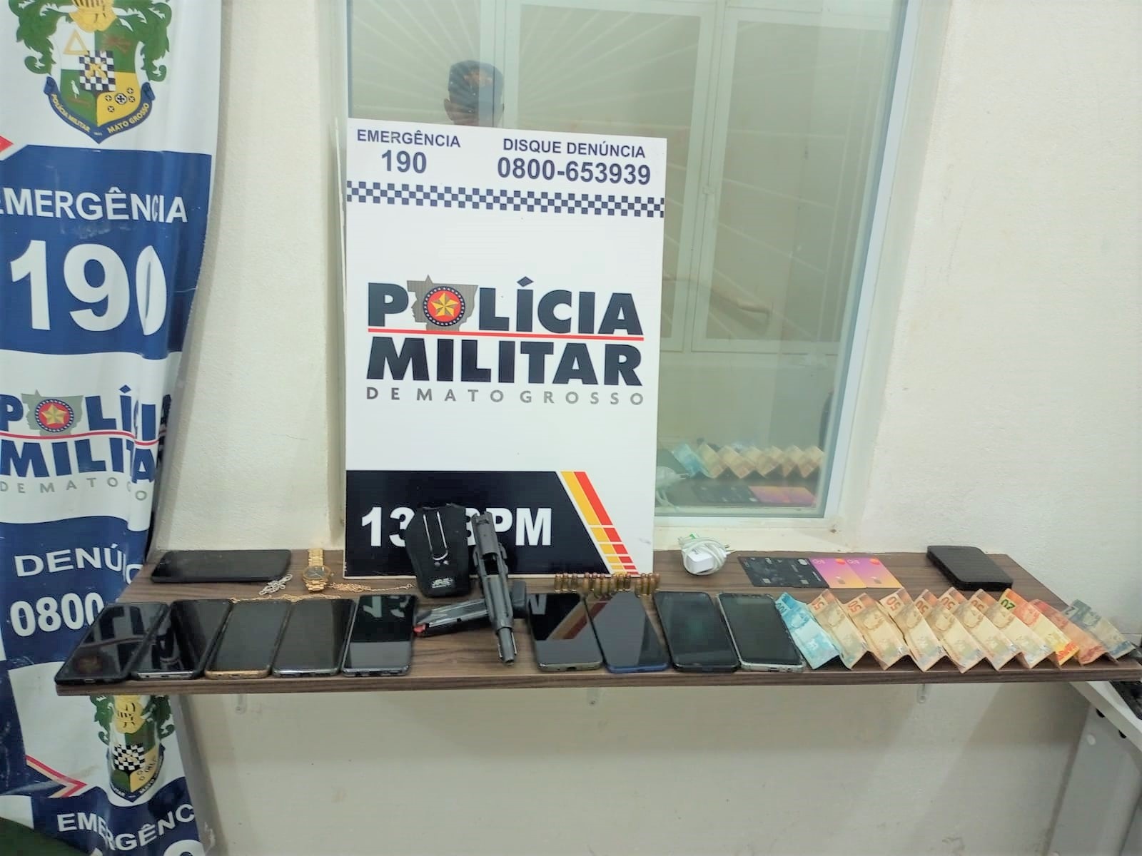 Quando chegaram no local indicados, os militares viram dois suspeitos pulando muros de residências próximas, conseguindo fugir das equipes. Um outro criminoso foi detido pelos policiais e em sua cintura foi encontrada uma pistola. O homem confessou ter sido um dos autores do roubo e que os dois que fugiram também estavam na ação e eram de Cuiabá. O suspeito que foi preso, estava com o dinheiro roubado no bolso da bermuda.