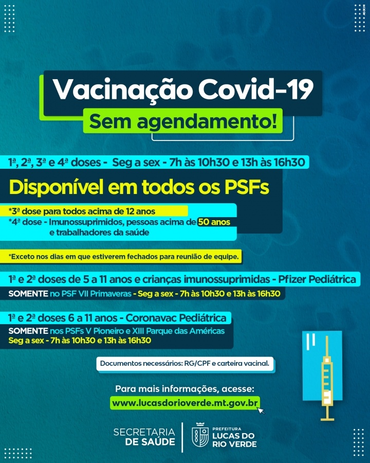 A Secretaria de Saúde de Lucas do Rio Verde informa que já está disponível a aplicação da 4ª dose da vacina contra a Covid-19 para pessoas acima de 50 anos de idade e trabalhadores da saúde, que tomaram a terceira dose há, pelo menos, quatro meses.