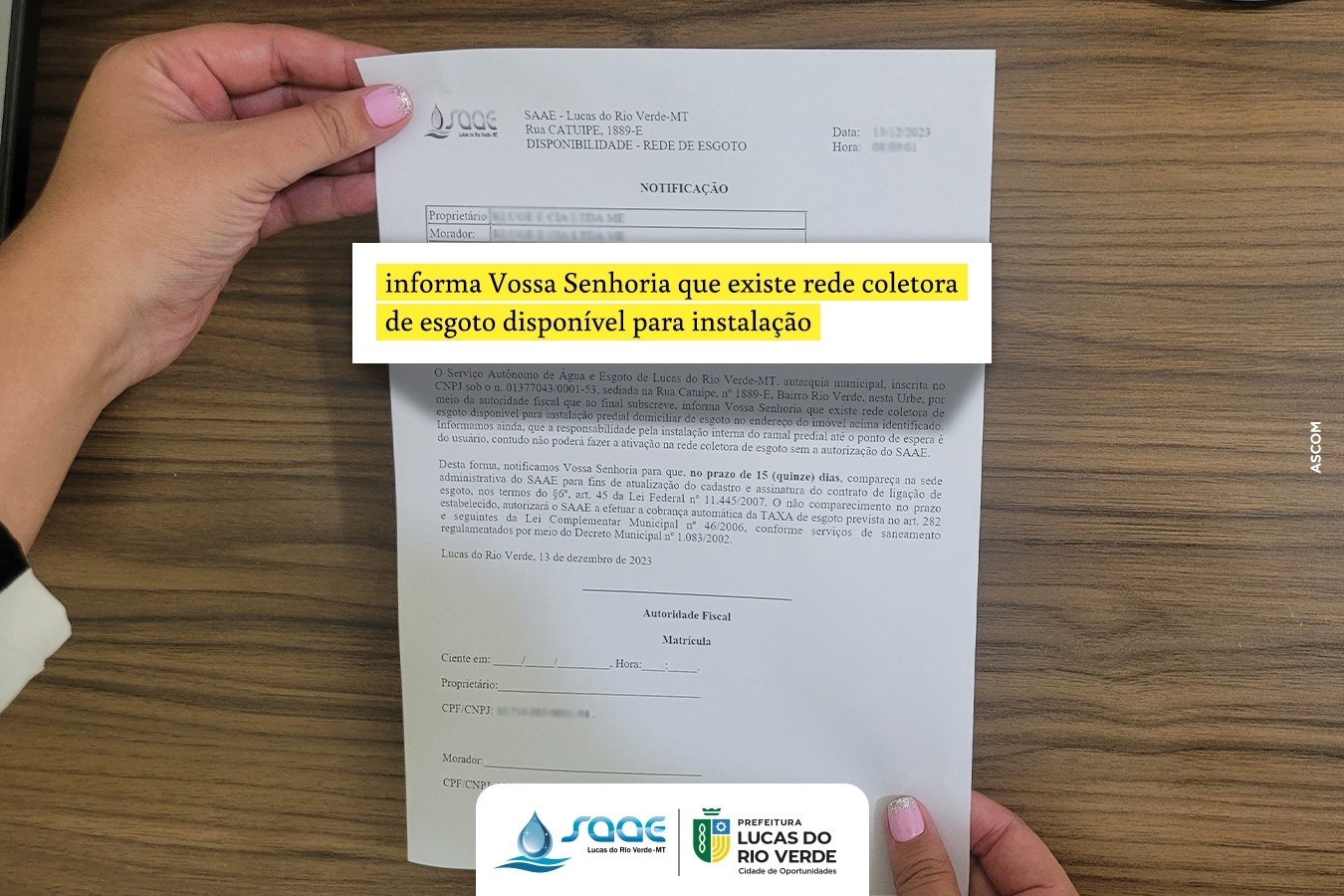 O Serviço Autônomo de Água e Esgoto (Saae) de Lucas do Rio Verde, em parceria com a Secretaria de Infraestrutura e Obras, está avançando com as obras de implantação da rede coletora. Com isso, cerca de 500 residências do bairro Parque das Emas estão sendo notificadas, a partir desta quarta-feira (13), para que realizem a ligação da rede de esgoto.